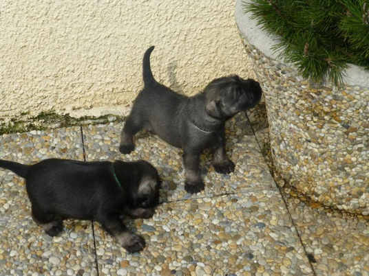 Pokud je pěkné počasí tak štěňátka dovádějí na zahradě, nyní již dostávají více masitého jídla smíchaného s granulemi Carneval Ultra Premium Pet Food Activ Puppy, aktuální váhy jsou 2750 - 3150 g. Už jsou 2x odčervena a ve čtvrtek 9.4.2015 je čeká čipování, očkování a komplexní prohlídka poradcem chovu.