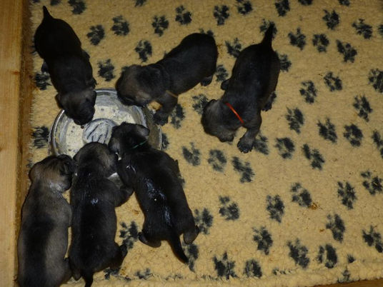 Dnes štěňátka ochutnala své první "opravdové" jídlo - mléčný příkrm, moc si pochutnala a s plnými bříšky spokojeně usnula. Aktuální váhy jsou 1250 -1450 g.